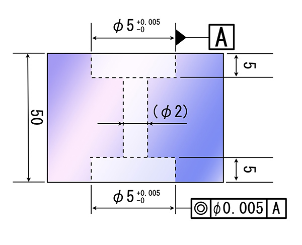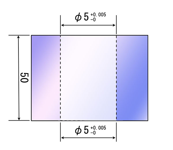 精密ゲージ製作で、下図のようなφ5+0.005-0の穴加工がありました。設計者側の意図では、加工深さが5mmと浅くすることでコスト削減を狙い、このような図面で描かれています。