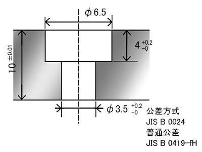 測定用ゲージや測定治具等に、ボルト穴やザグリ指示のある図面で、公差等級がf級の場合、6以下の長さ寸法の公差は±0.05とJIS規格で決められており、図面通りに仕上げようとすると焼き入れ前加工での仕上げが困難となり、焼き入れ後の加工が必要となる場合があり、製作コストが高くなってしまいます。