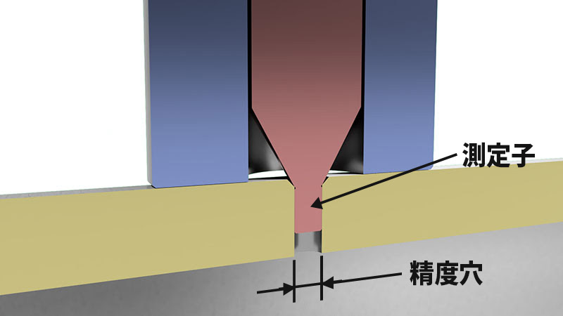 - 測定子の直径を精度穴に対してガタなく製作することにより、測定時の姿勢を保つことで、常に安定した結果を実現。