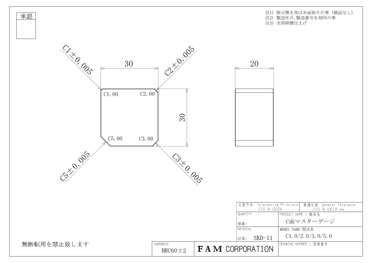 「面取り用のマスターゲージのみの製作は可能でしょうか? イメージしては C1.0/C2.0/C3.0/C5.0 が角に加工されたブロックです」というご相談をいただきました。