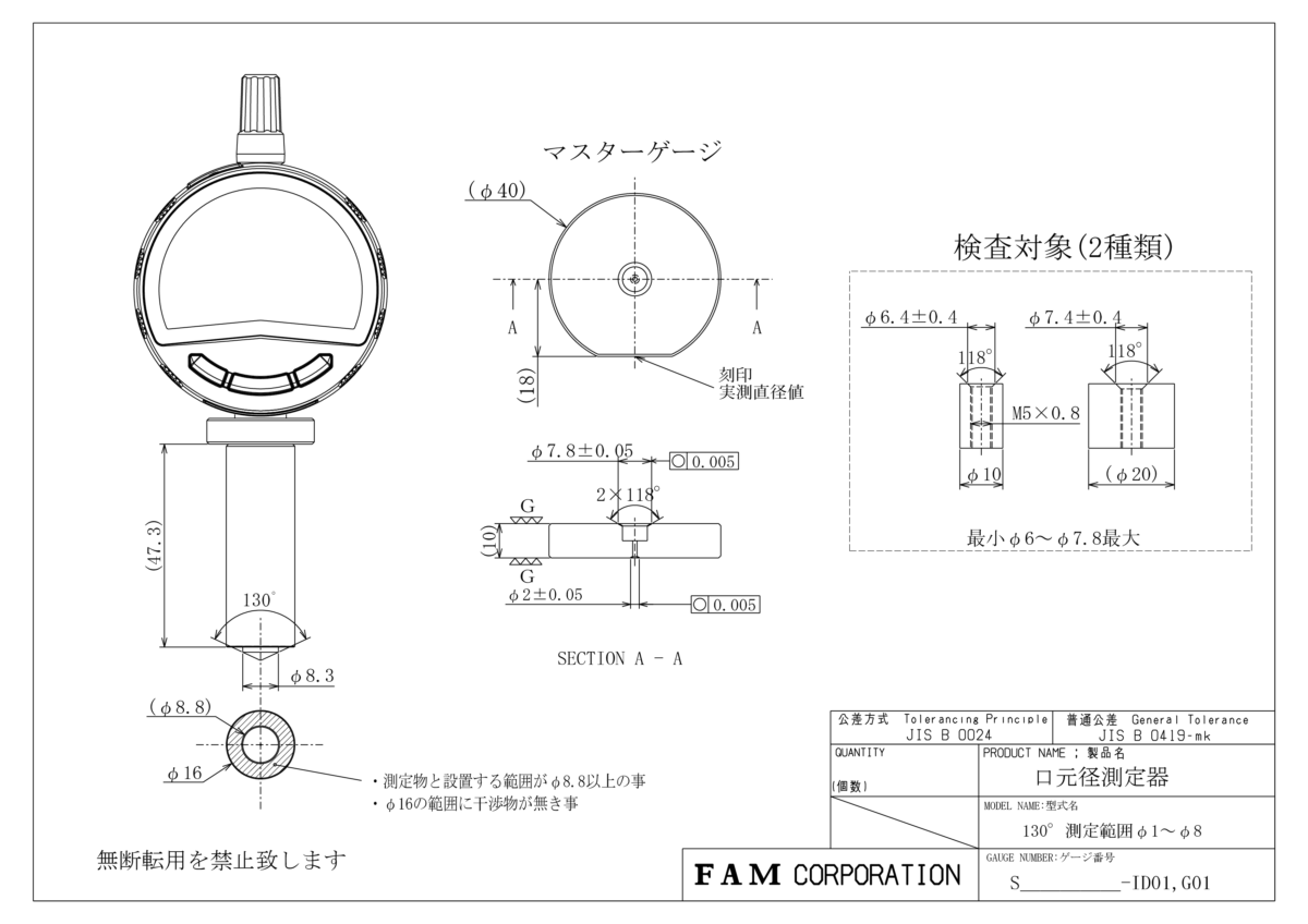 口元径測定器は先端の測定子が接触した時の穴直径をデジタル表示する測定器のため、測定子の角度(今回は130°)よりも小さい角度の口元径は全て測定可能です。※測定子の角度が鋭角になるほど測定精度は安定します