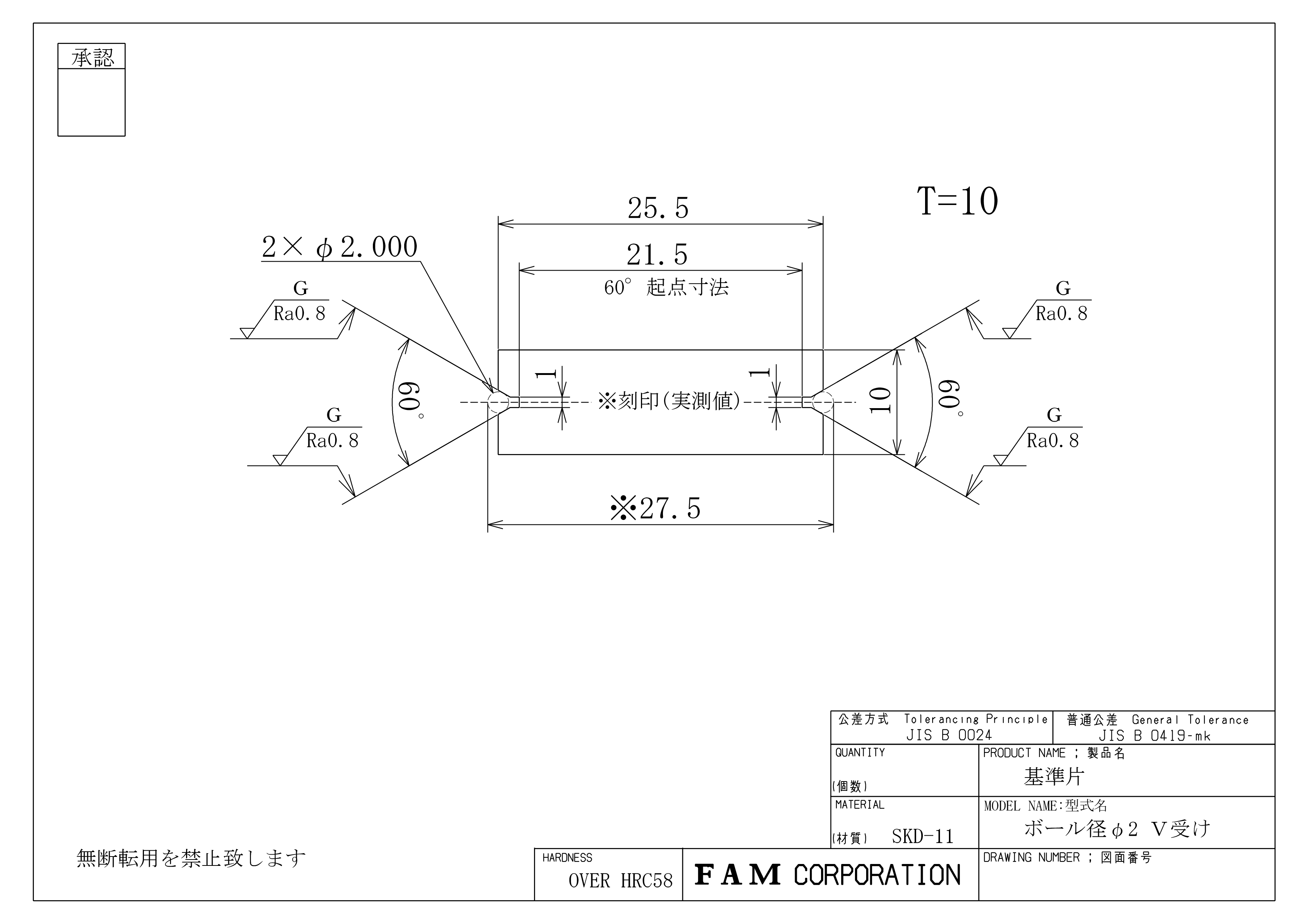 お客様の相談内容をもとに社内で検討しました。検討の結果、ボール径φ2をV受けで支える形状の基準棒を設計しました。①寸法25~30mmの範囲での高精度検査を保証するために、SKD-11(HRC58以上)の高硬度を採用し、安定化処理を施しました。②そして、耐摩耗性と耐久性を確保するために検査箇所は研磨指示をしています。③さらに、ファムで実測した寸法を刻印することでさらなる基準精度向上につなげています。