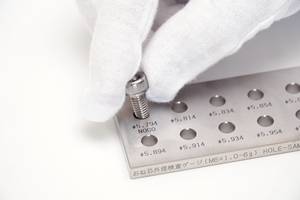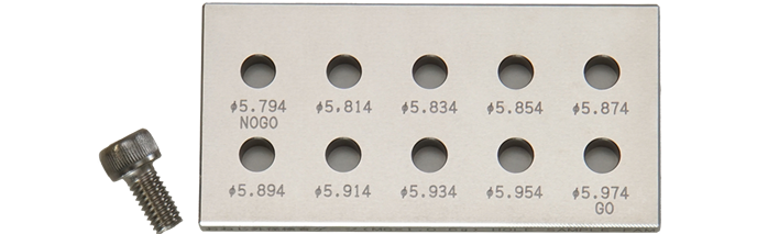 サンプルに、市販のM6×1ボルトの外径を検査したところ、Φ5.854が通り、Φ5.874が止まることが簡単に検査できました。
