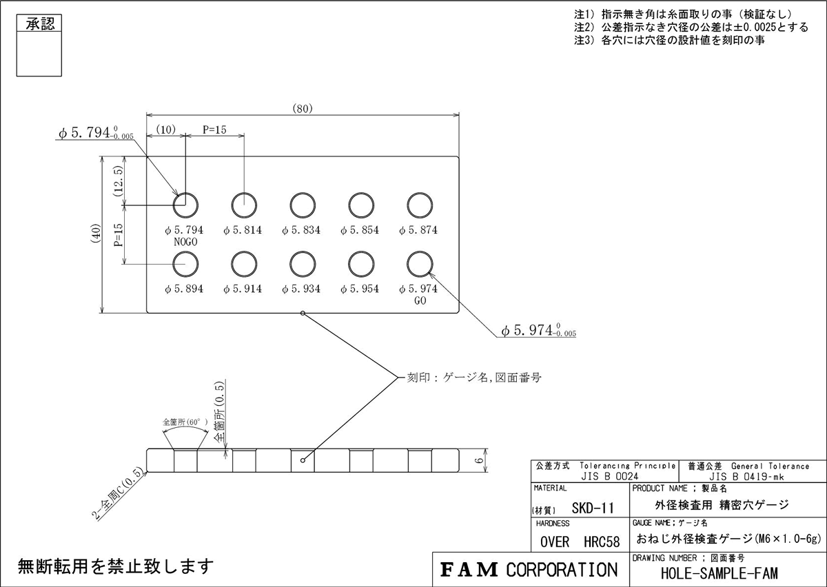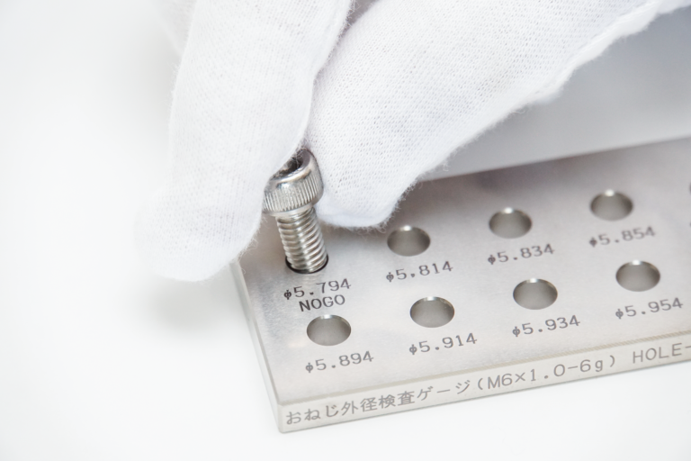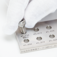 サンプルに、市販のM6×1ボルトの外径を検査したところ、Φ5.854が通り、Φ5.874が止まることが簡単に検査できました。